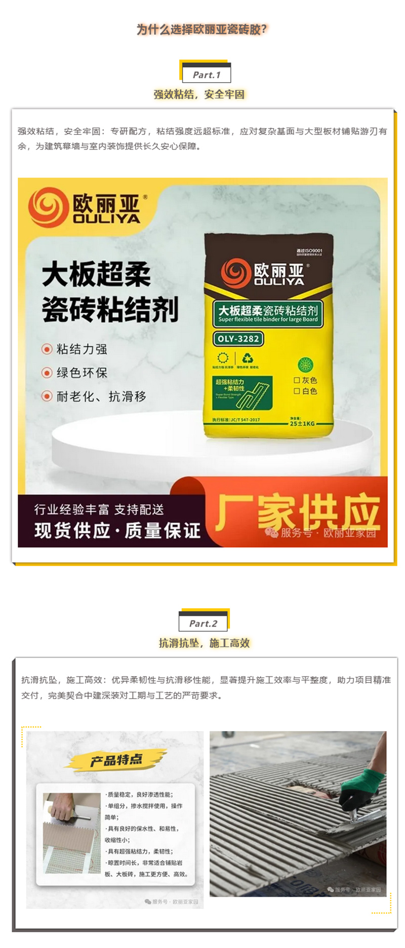 东莞市欧丽亚环保材料有限公司专注于“环保,创新”型建筑装饰材料,瓷砖胶,硅藻泥,石材防水背胶,抗裂砂浆,装饰砂浆,防水系列,自流平水泥,防霉腻子,二合一填缝剂的研发、生产、营销、技术咨询于一体的墙饰高新技术企业。